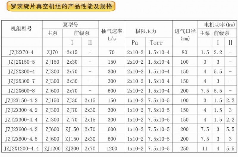 羅茨旋片真空機(jī)組的產(chǎn)品介紹JSJ2X型羅茨旋片真空機(jī)組是以羅茨泵為主泵,以旋片泵為前泵串聯(lián)而成。其結(jié)構(gòu)緊湊,操作方便。使用于除空氣及其它無可凝性及無腐蝕性氣體,廣泛應(yīng)用于需要大抽速和高真空的各種真空系統(tǒng)中。如:真空冶煉電力電容器、變壓器、真空浸漬處理、真空鍍膜設(shè)備中的預(yù)抽等。