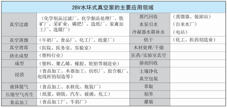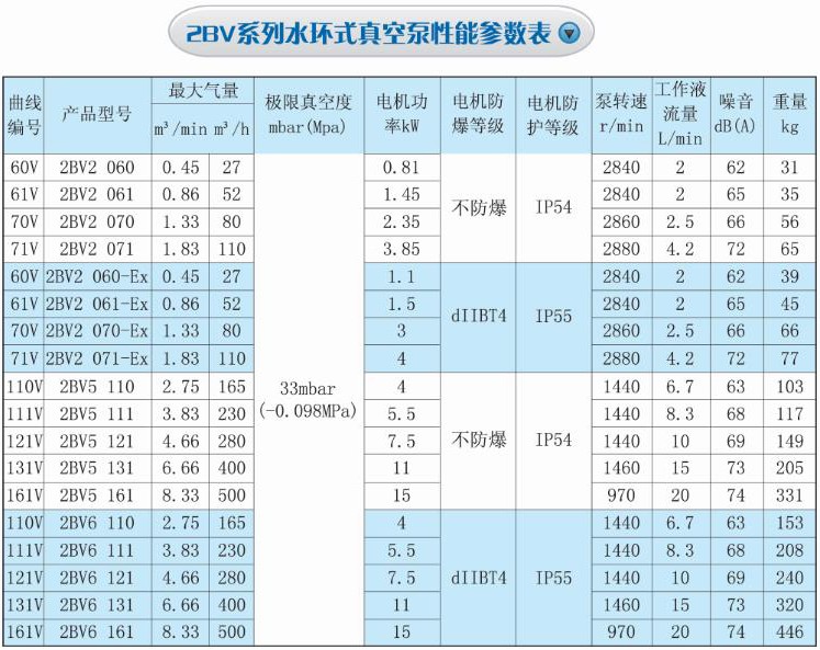 2BV系列水環(huán)式真空泵適用于抽出氣體和水蒸氣,吸氣壓力可以達(dá)到33mbar絕壓(97%真空度) 。當(dāng)水環(huán)真空泵在吸氣壓力接近極限真空(工作液的飽和蒸汽壓)下長(zhǎng)期工作時(shí),應(yīng)聯(lián)接汽蝕保護(hù)管,以對(duì)泵進(jìn)行保護(hù)。作為壓縮機(jī)用時(shí),其壓力大至0.26MPa (絕壓)。2BV系列水環(huán)真空泵作為新一-代節(jié)能型產(chǎn)品,其以優(yōu)良的性能及眾多優(yōu)點(diǎn)將取代同性能的SK/2SK系列水環(huán)真空泵及W/WY/WL系列往復(fù)真空泵。2BV2- -Ex/2BV6系列水環(huán)式真空泵/壓縮機(jī)主要用于抽出爆炸性氣體,及各類易燃、易爆環(huán)境中工作,其性能參數(shù)與2BV2/2BV5系列相同。
